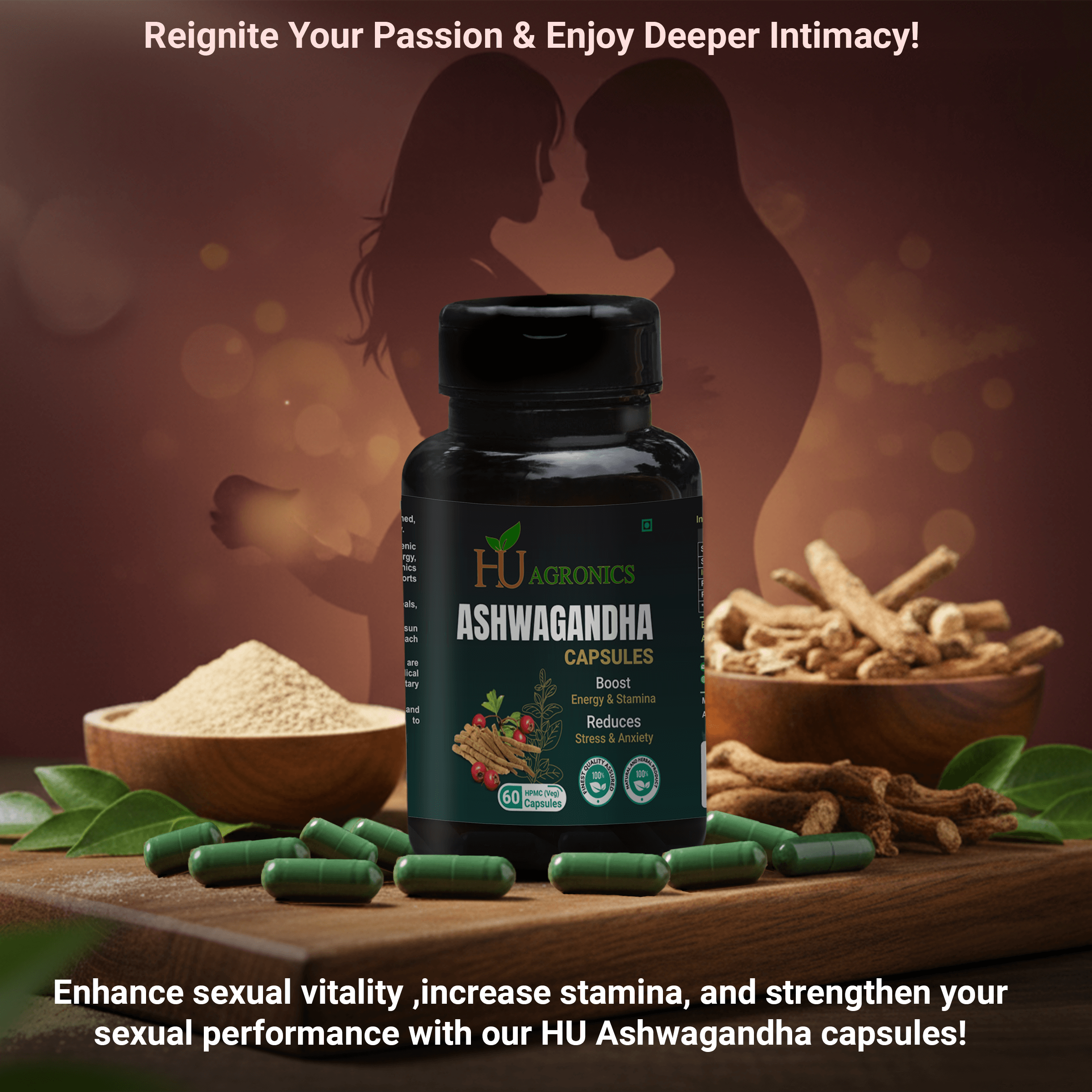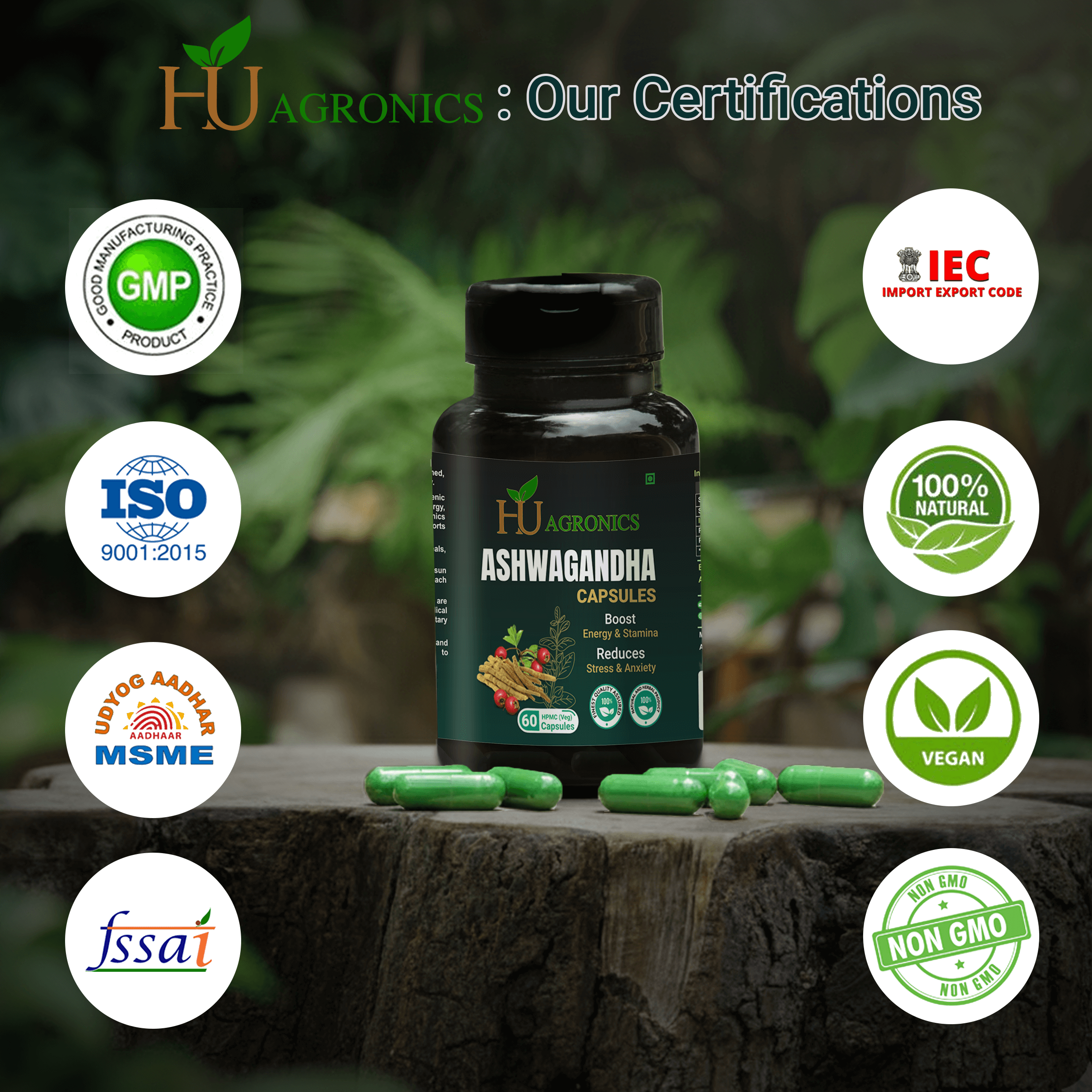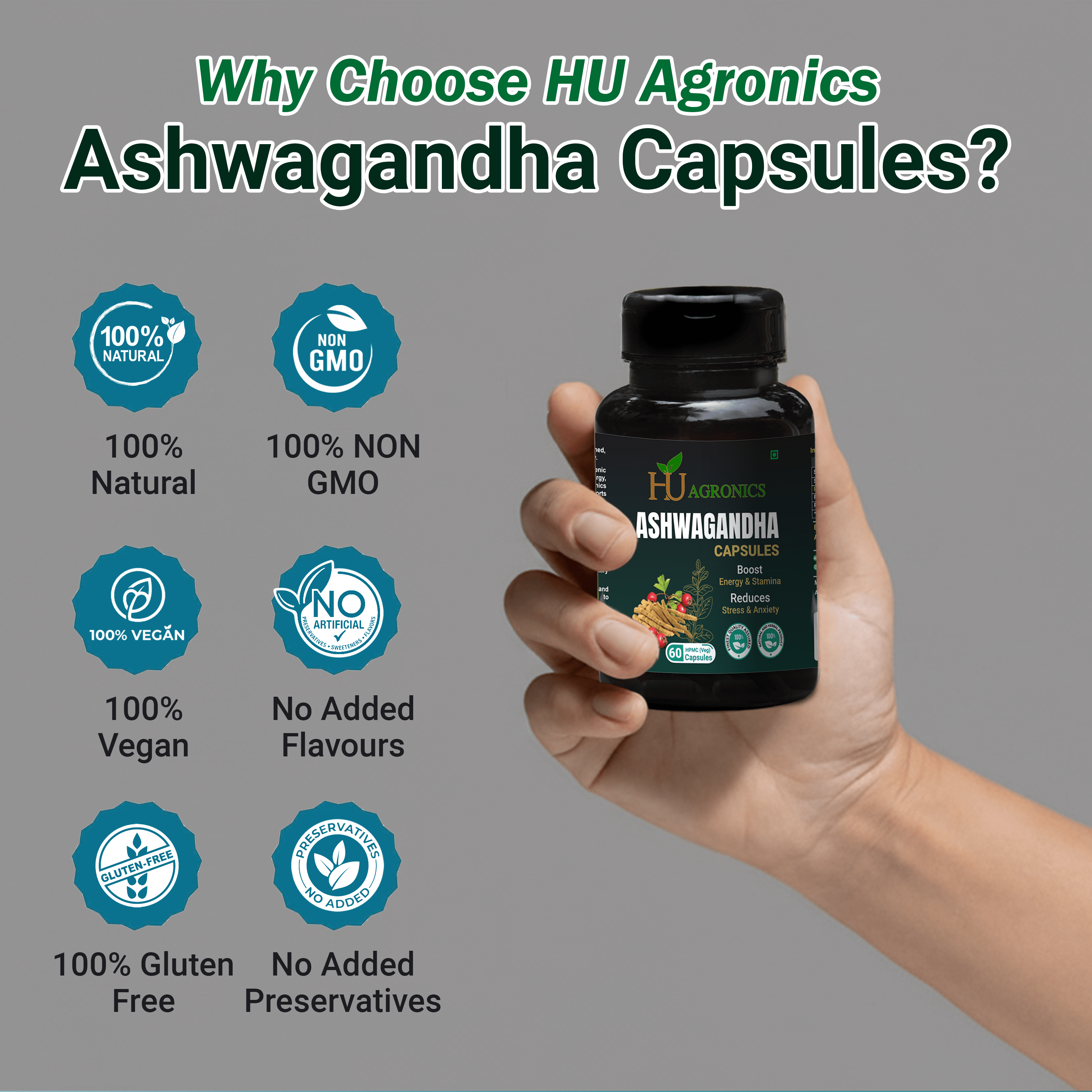 Balance your mind, body, and energy with HU Agronics Ashwagandha Capsules, made from 100% pure and natural Ashwagandha root powder. Known as Withania Somnifera, Indian Ginseng, or Winter Cherry, Ashwagandha is one of the most powerful herbs in Ayurveda, used for over 3,000 years to restore vitality, calm the mind, and fight fatigue.