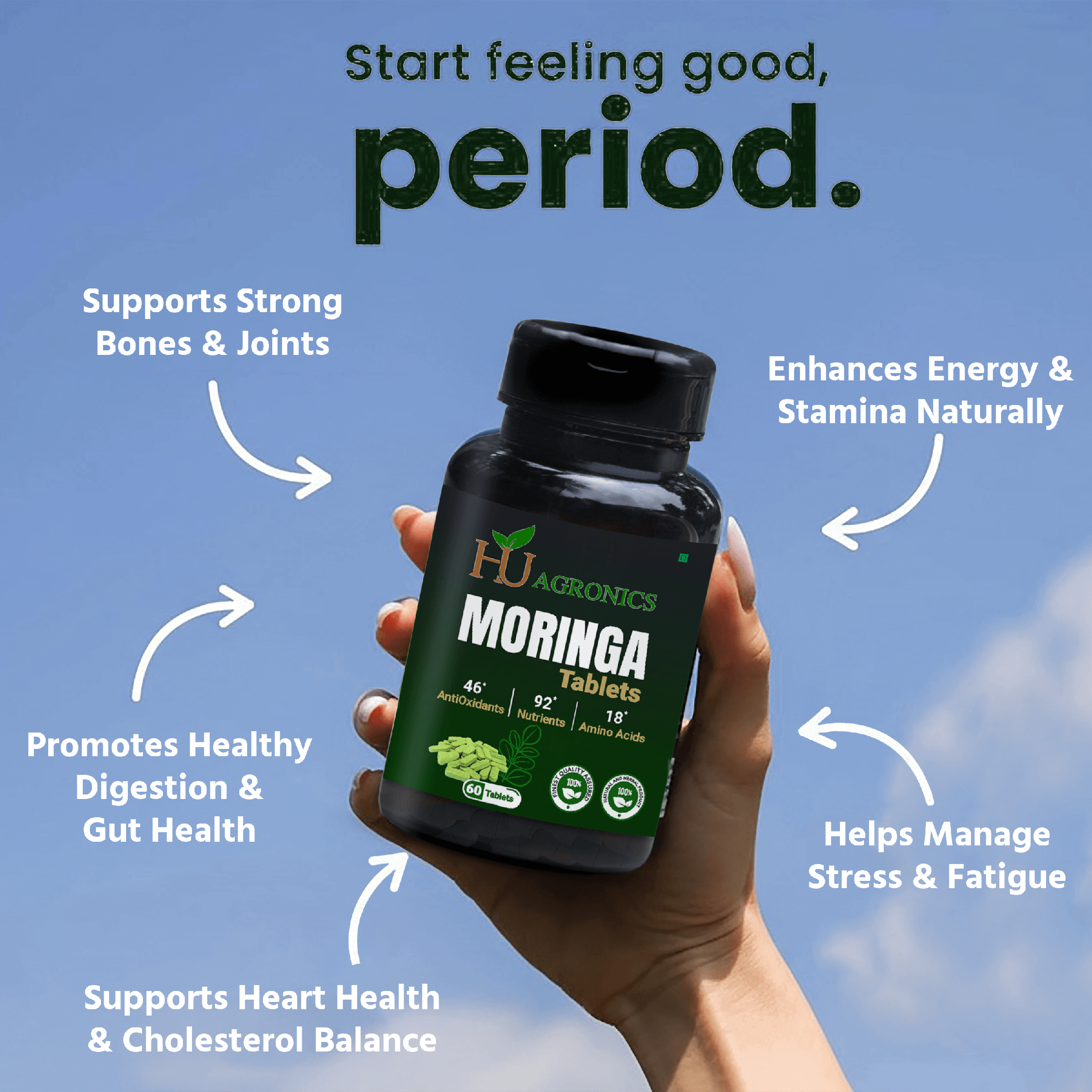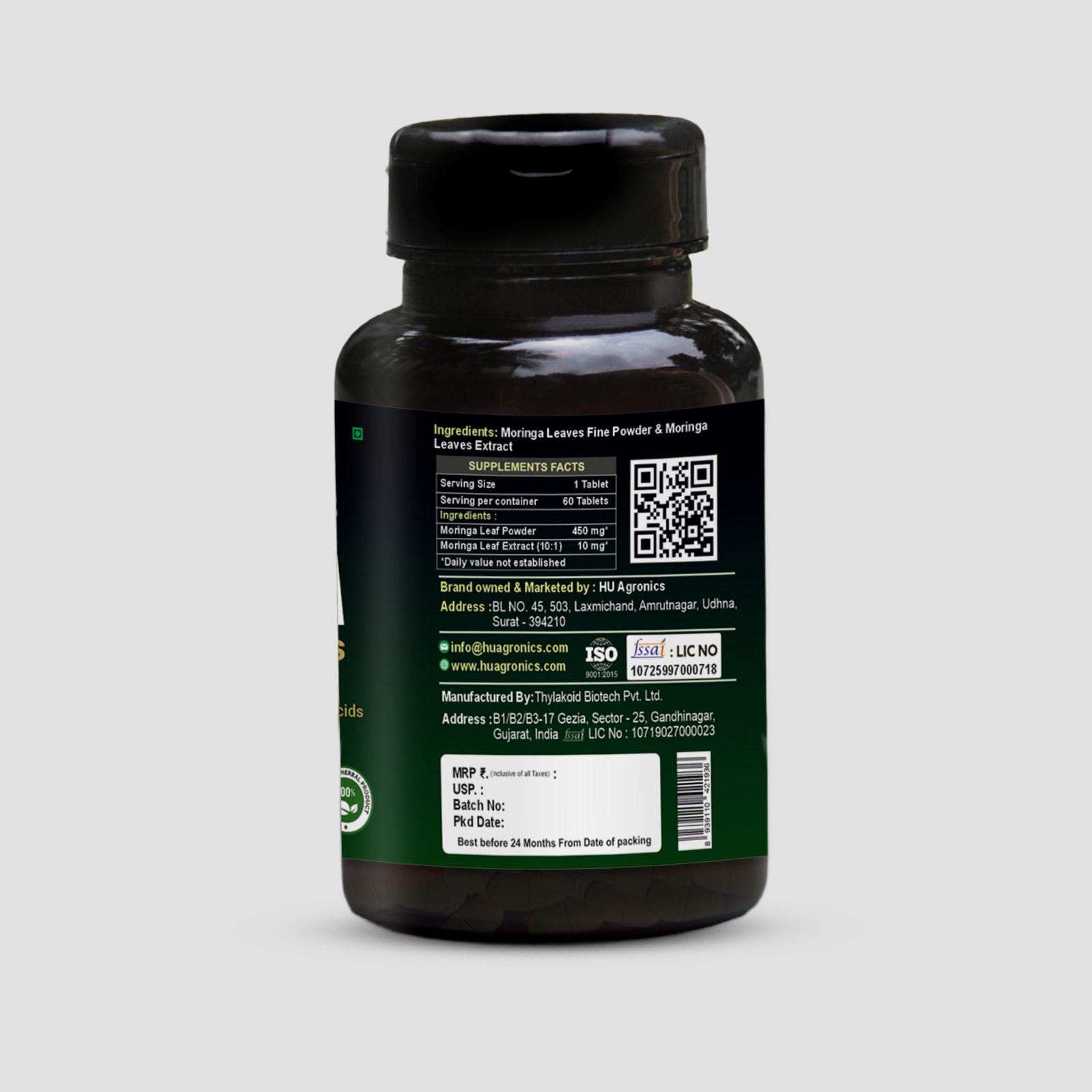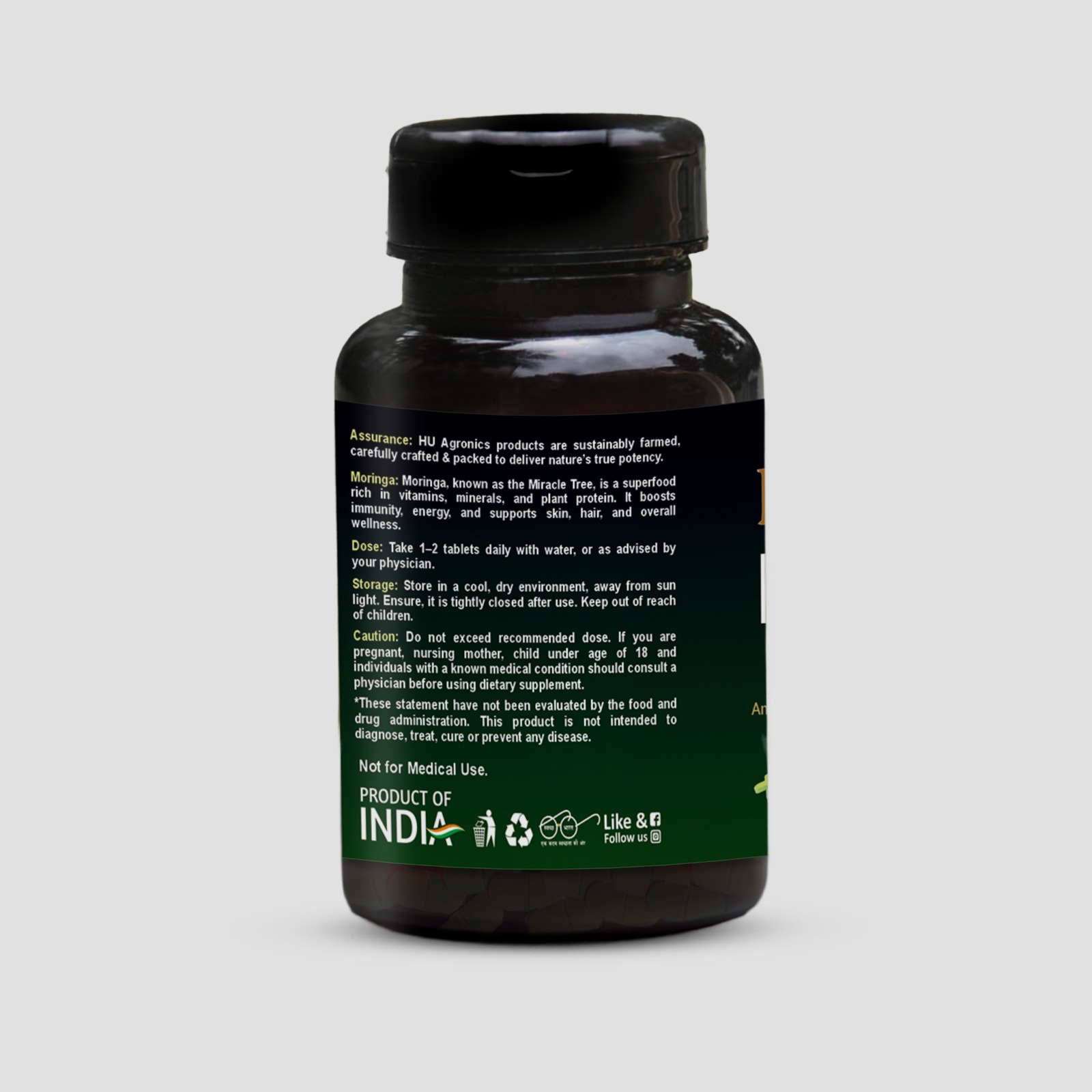 Moringa is often called the “Miracle Tree” because of its incredible nutritional profile: it contains 92+nutrients, 46+ antioxidants, and 18 amino acids (including all 9 essential ones). This makes HU Agronics Moringa Tablets one of the most complete plant-based supplements for energy, immunity, detox, and overall wellness.